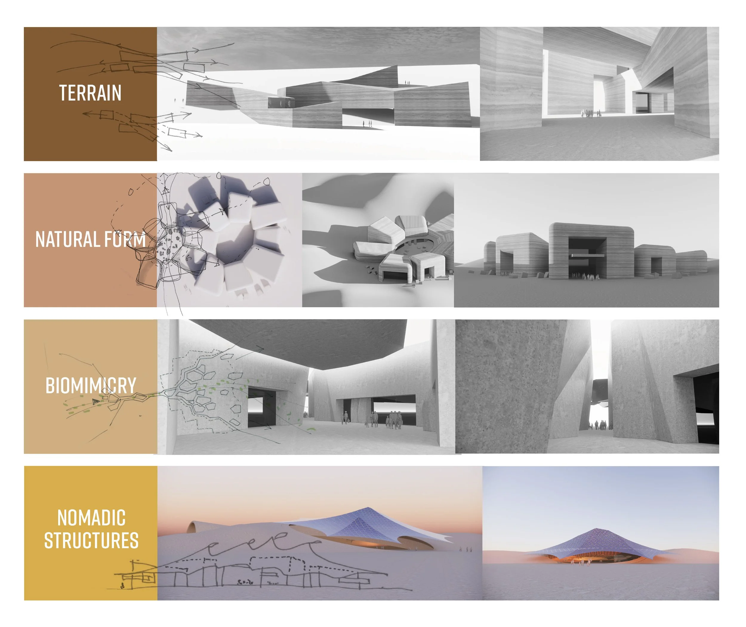 Possible themes were explored to base architectural design on, including natural and cultural heritage and a series of 4 high level architectural concepts produced to help illustrate and promote the idea of a Desert Museum.