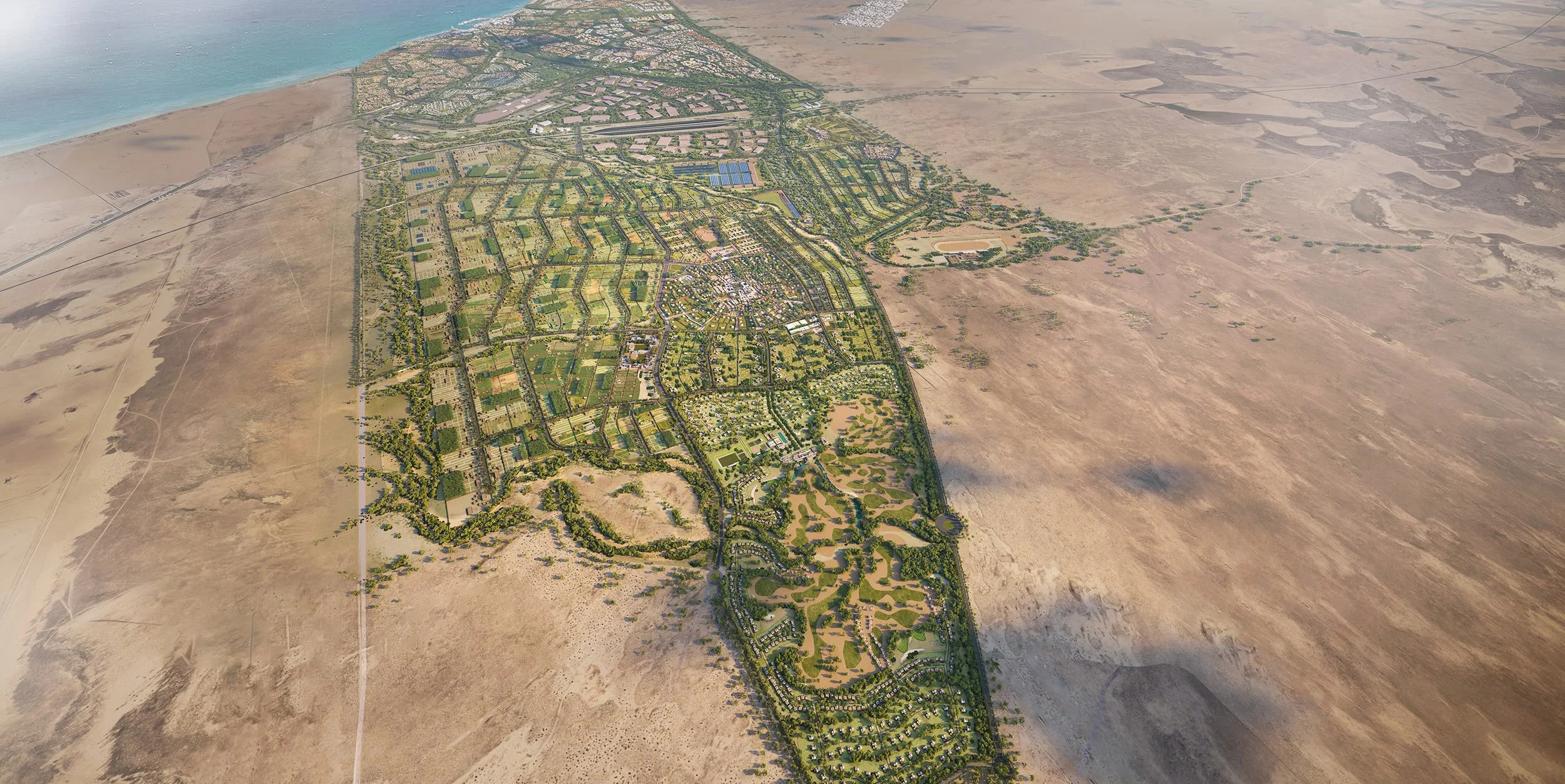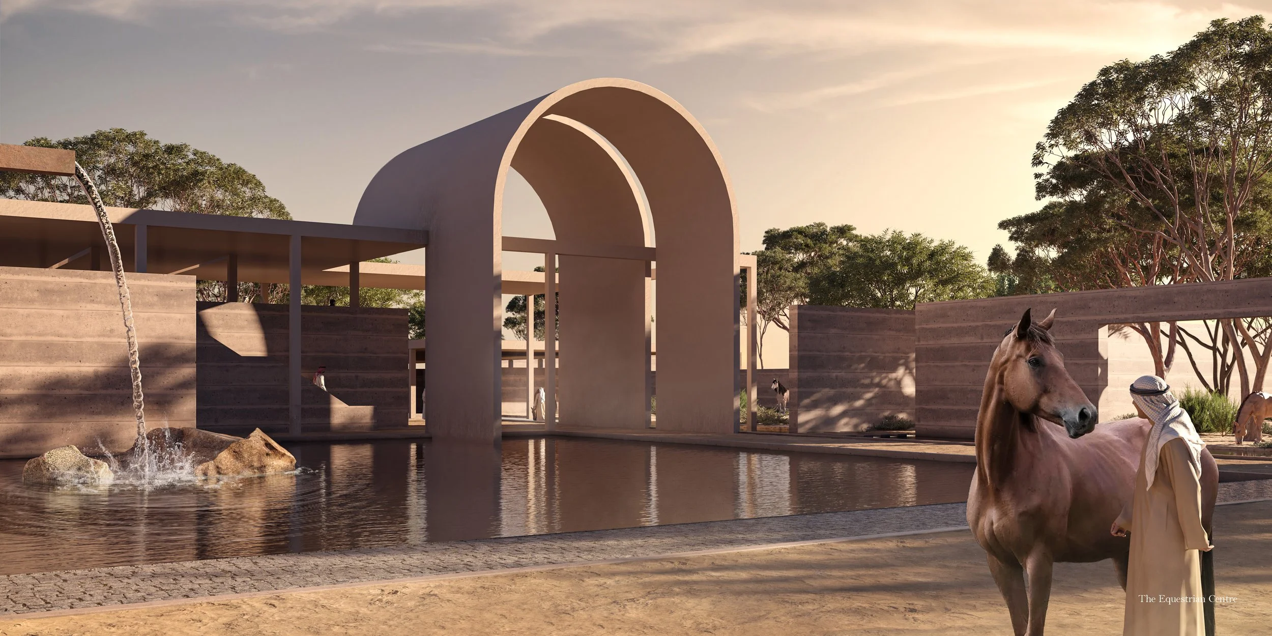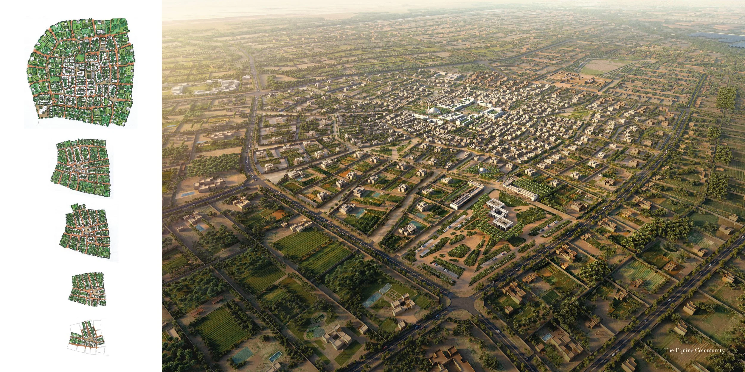 The Concept for The Farmlands is presented as a Green Grid a regular and highly efficient subdivision of the land which is defined by generous screening belts of native trees, connected by a Green Spine that accompanies primary infrastructure through the core of the project. A sequence of development nodes includes a new Distribution Hub, an initial phase built around an Equine Community, where the Arabian horse is celebrated, a Golf node, Rural community and a sequence of smaller destinations with an emphasis on popular Leisure pursuits.
